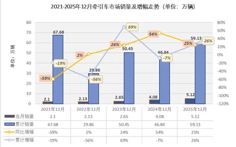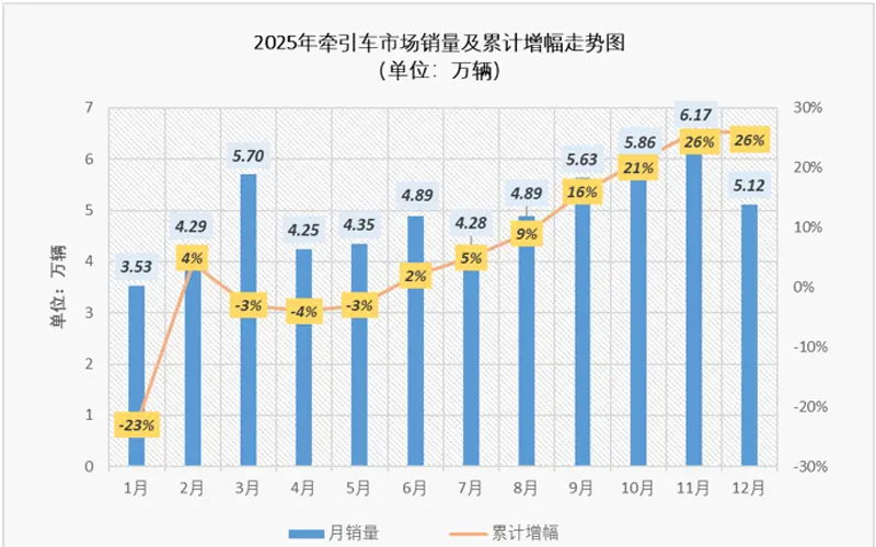 In terms of cumulative sales, the tractor truck market sold a total of 591,300 units in 2025, a year-on-year increase of 26%. This cumulative sales growth rate was the same as after November 2025 (+26%), and approximately 122,900 units more than the total sales in 2024.