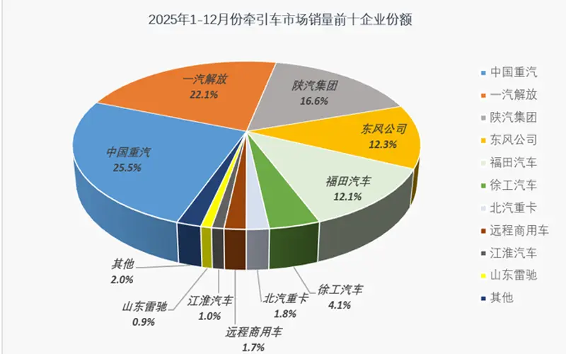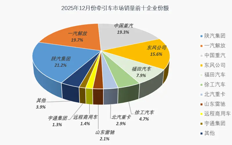 From an industry perspective, compared to the previous month, the top ten players in the tractor truck market remained unchanged in December 2025. The rankings changed as follows: Shaanxi Automobile rose two places to the top of the monthly list; BAIC Heavy Truck rose one place to seventh; Shandong Leichi rose one place to eighth; only Dongfeng, Foton, and XCMG (ranked 4th-6th) and Yutong (ranked 10th) maintained their rankings.
