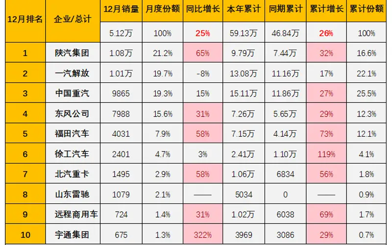 Specifically, looking at the top ten companies in terms of cumulative sales in 2025, most of them achieved growth (nine of the top ten saw increases and one saw a decrease, as shown in the chart above). Among them, XCMG, Foton, Farizon, and BAIC Heavy Truck saw significant year-on-year increases in cumulative sales of 119%, 73%, 69%, and 56% respectively, making them the leading companies in terms of growth. Sinotruk, FAW, Shaanxi Automobile, and Dongfeng saw year-on-year increases in cumulative sales of 27%, 17%, 32%, and 29% respectively, while Shandong Leichi saw net growth.